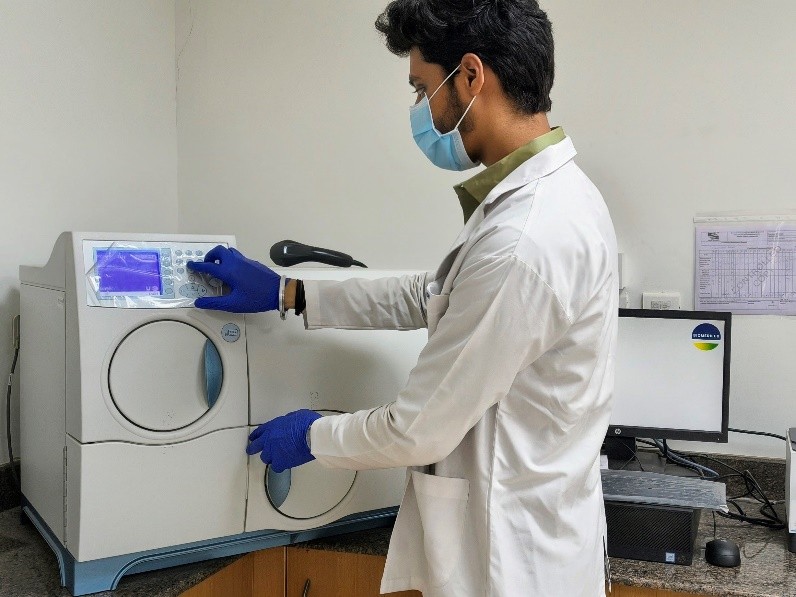 Separate rooms for media preparation, washing, and sterilization with autoclaves, hot air ovens, and media storage facilities.